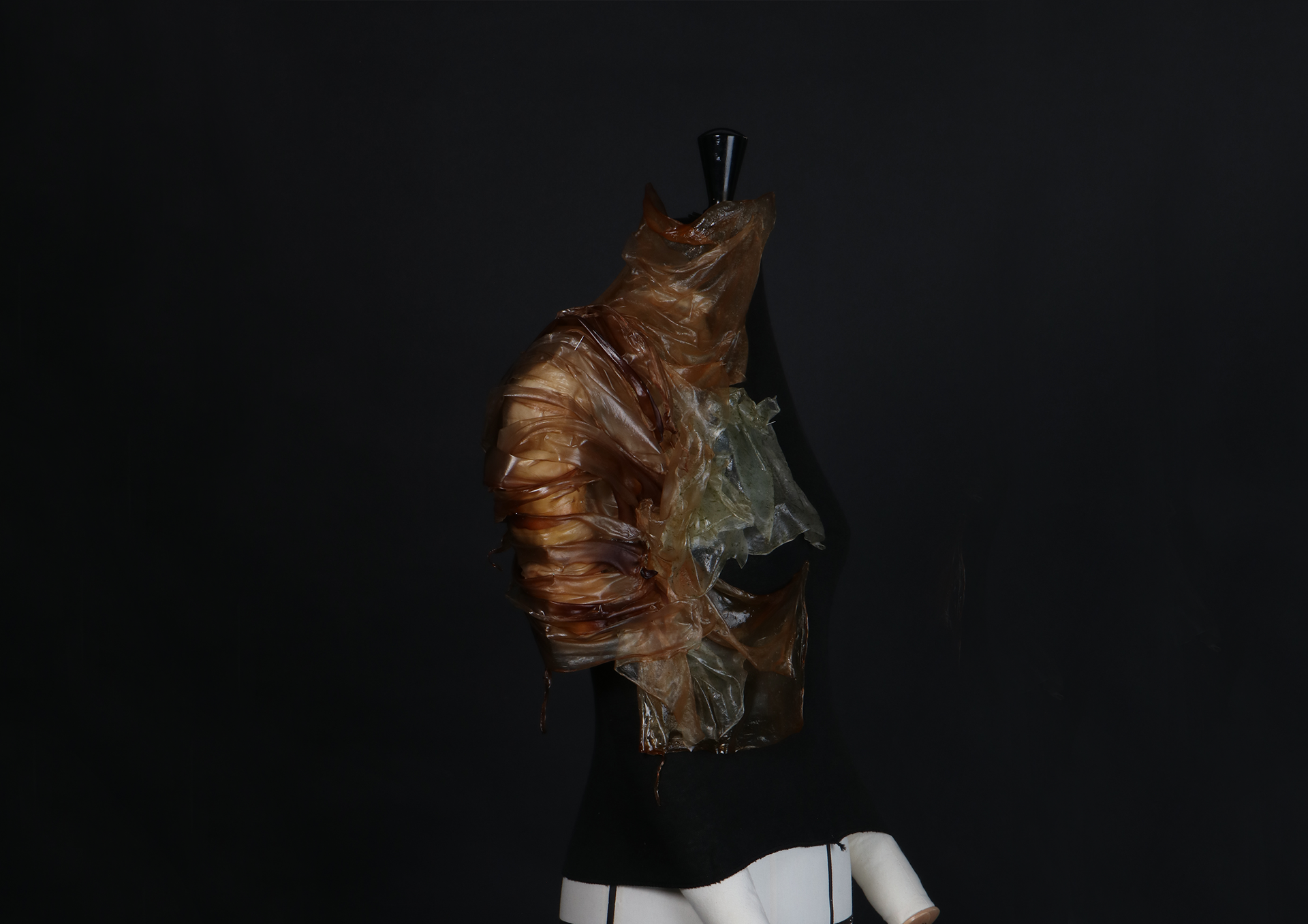 This project explores alginate a biodegradable material derived from seaweed, dyed with it's natural pigments. Through experimenting with texture, colour, and form, we crafted a fashion piece echoing seaweed’s movement. After use, it dissolves in water, closing the loop. Our documented process encourages sustainable design and material innovation beyond conventional plastics.