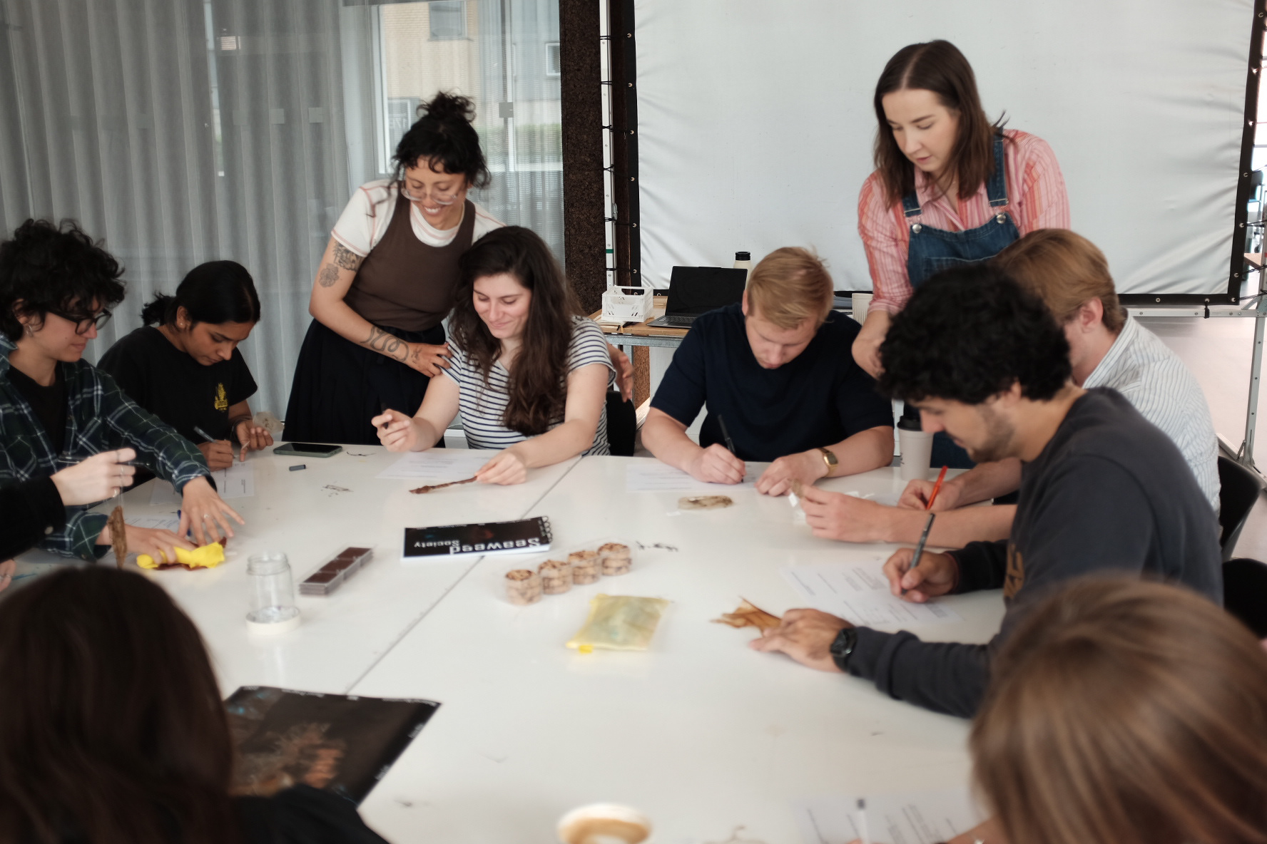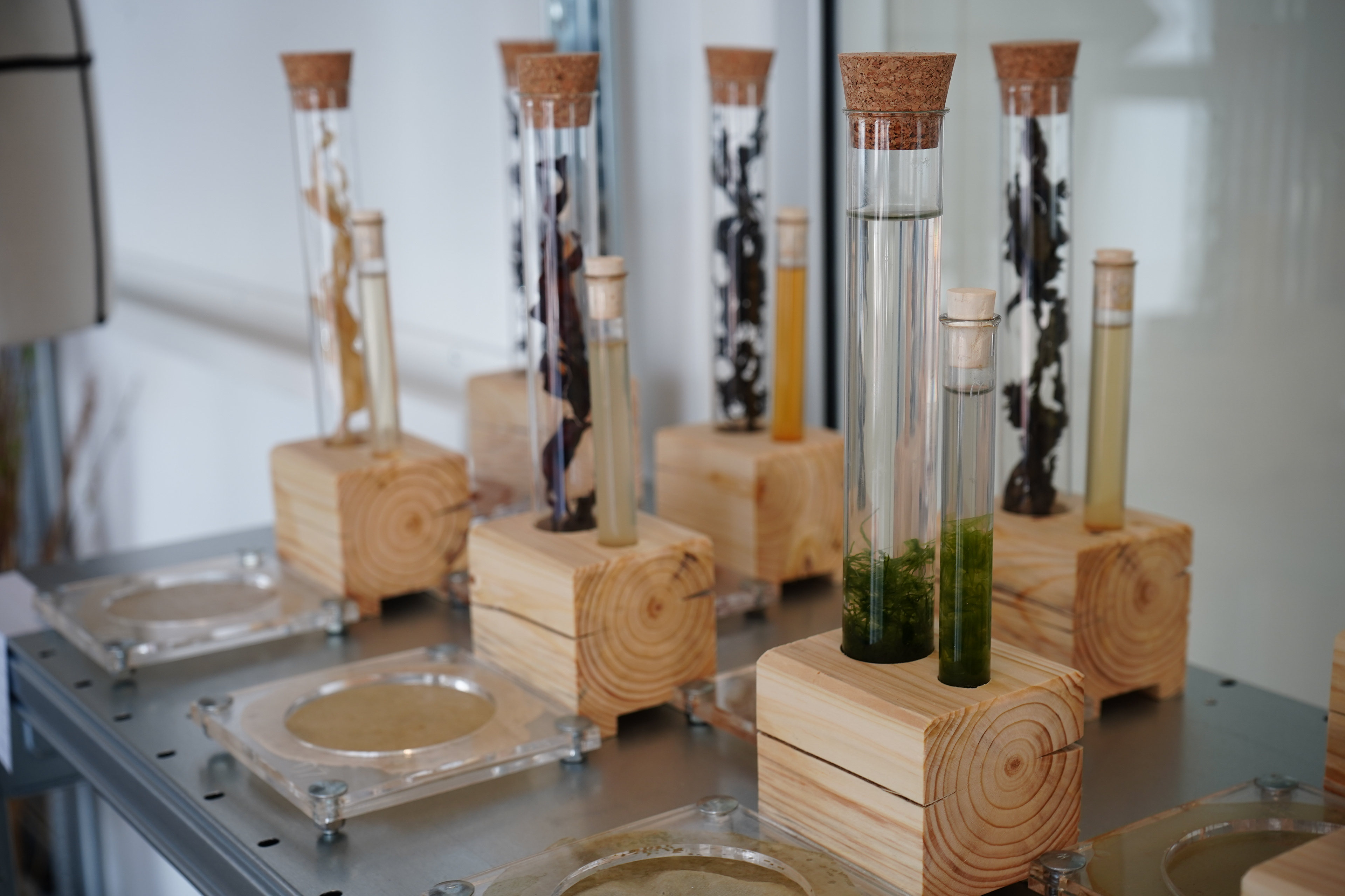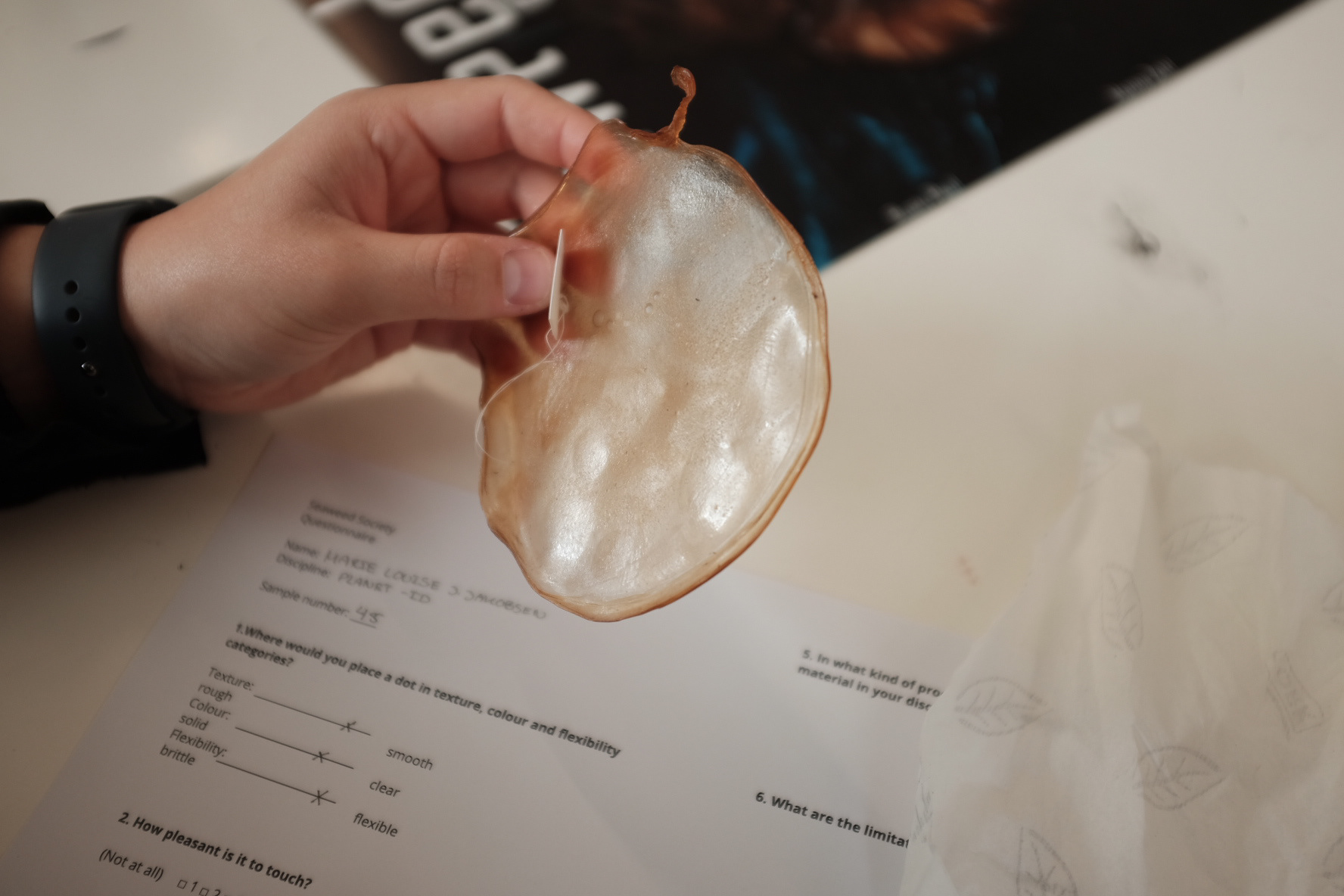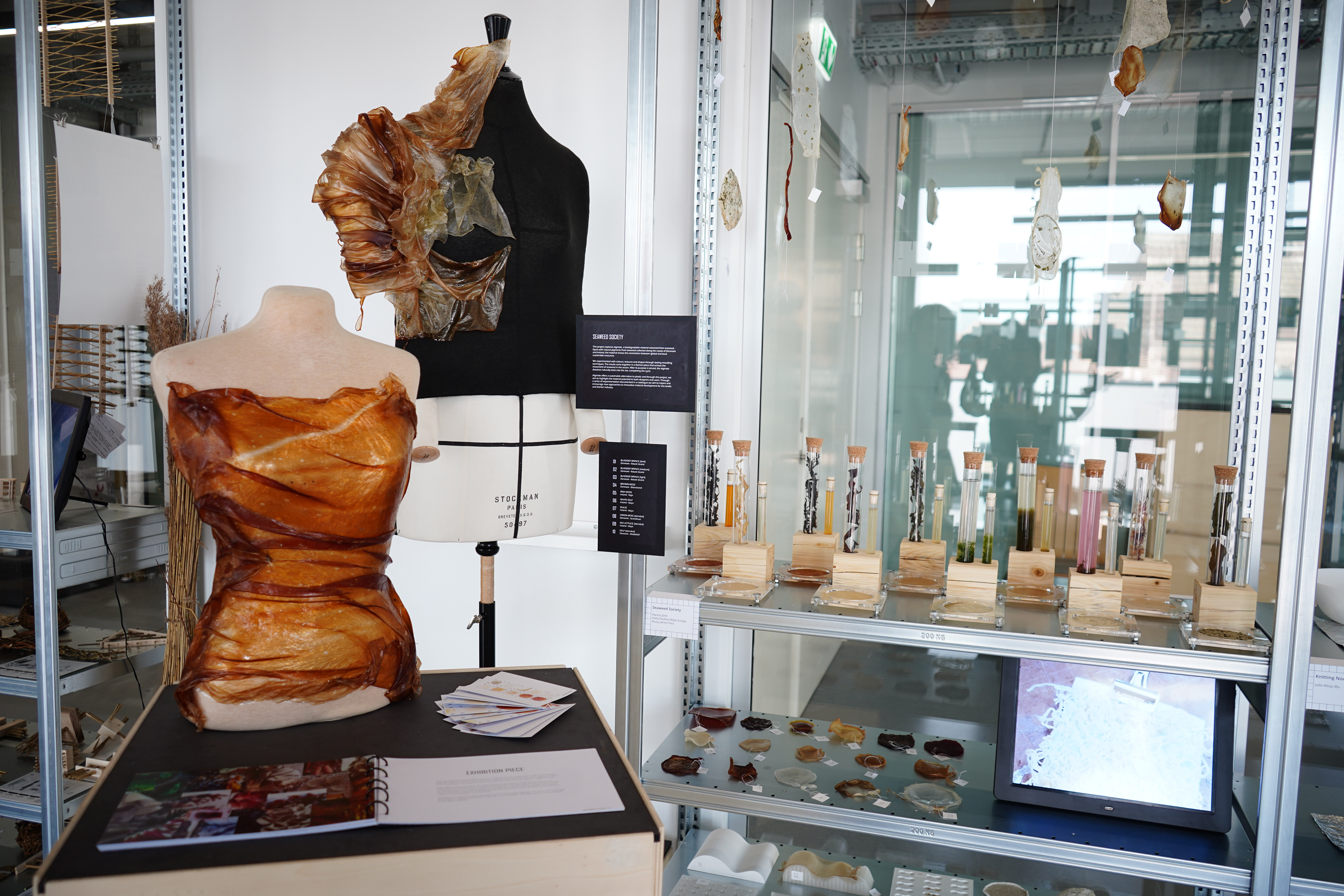We explored texture and color in alginate by using seaweed collected from Denmark and Ireland. Through natural dyeing and material experiments, we created a series of biodegradable bioplastic samples using sodium alginate valued for its flexibility, film-forming, and non-toxic properties.