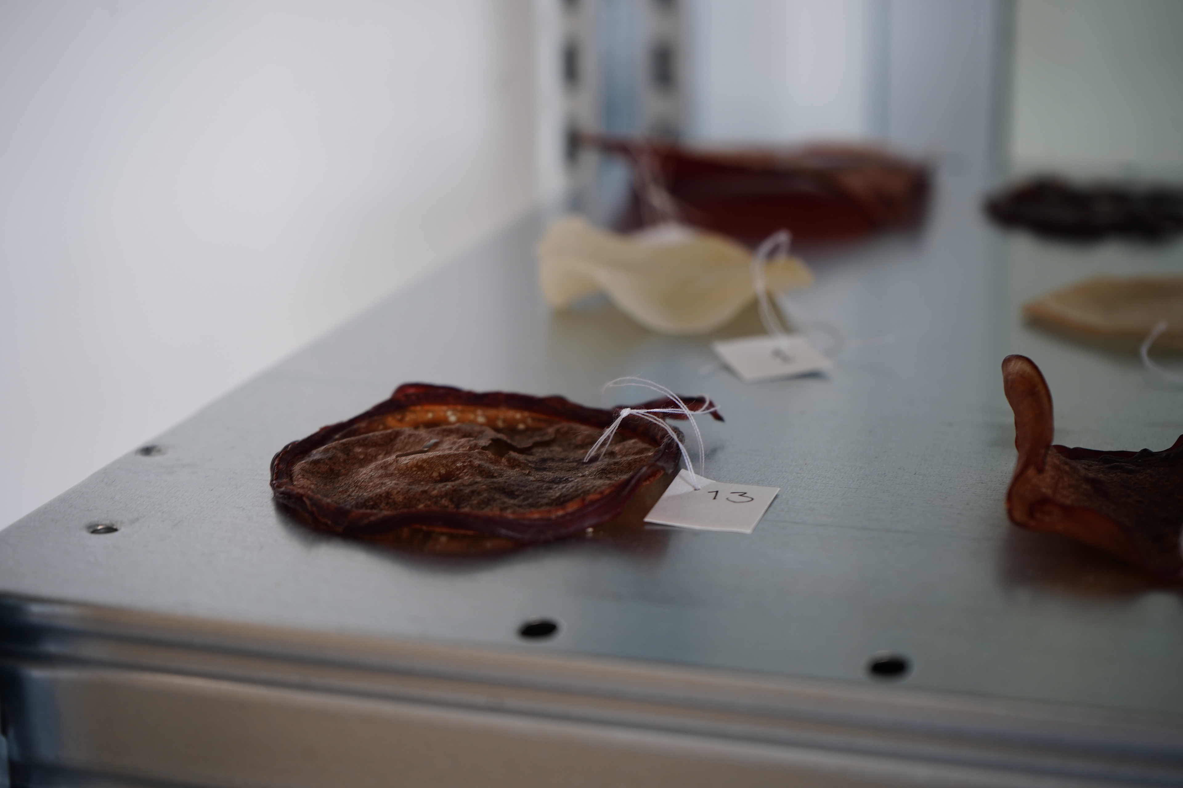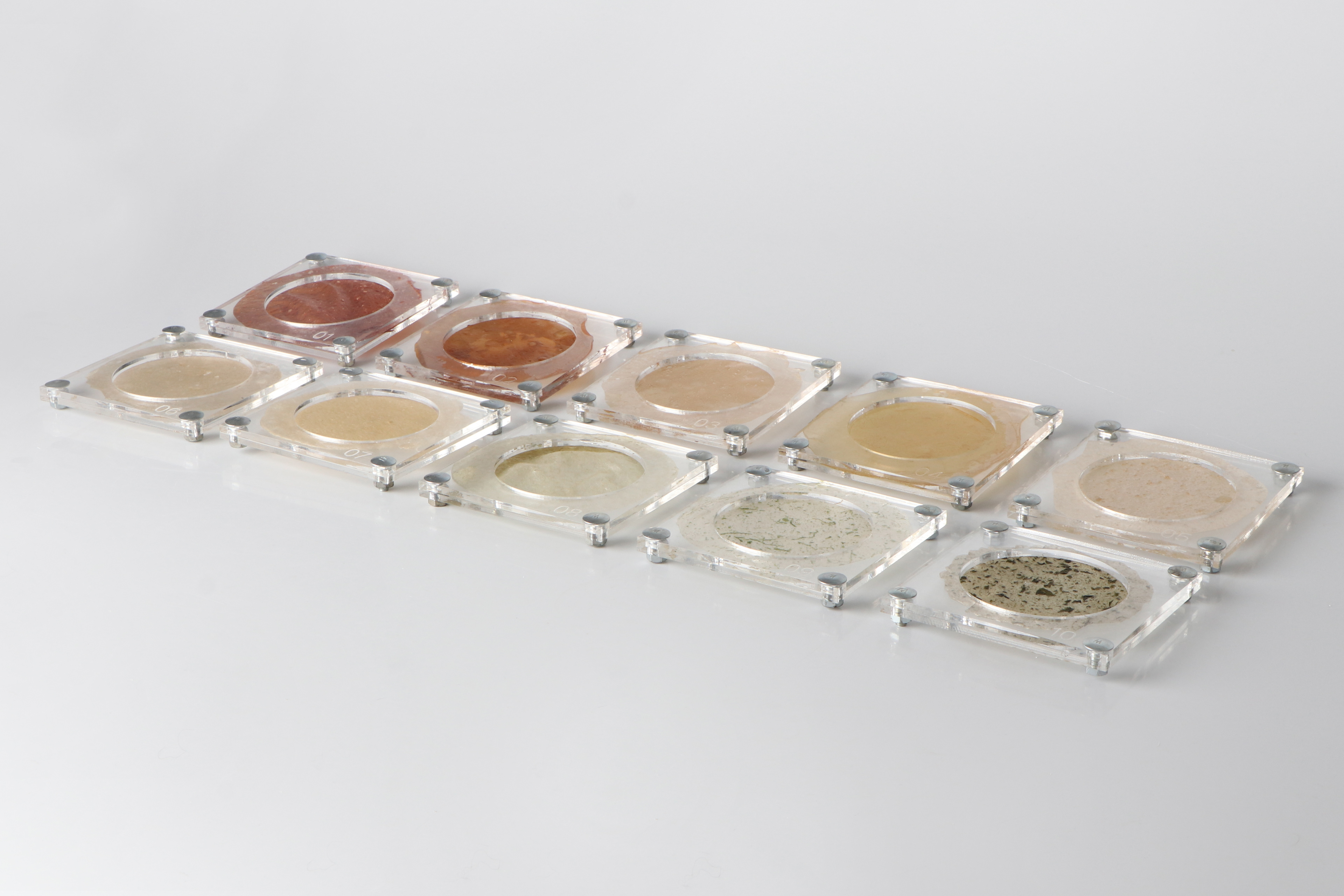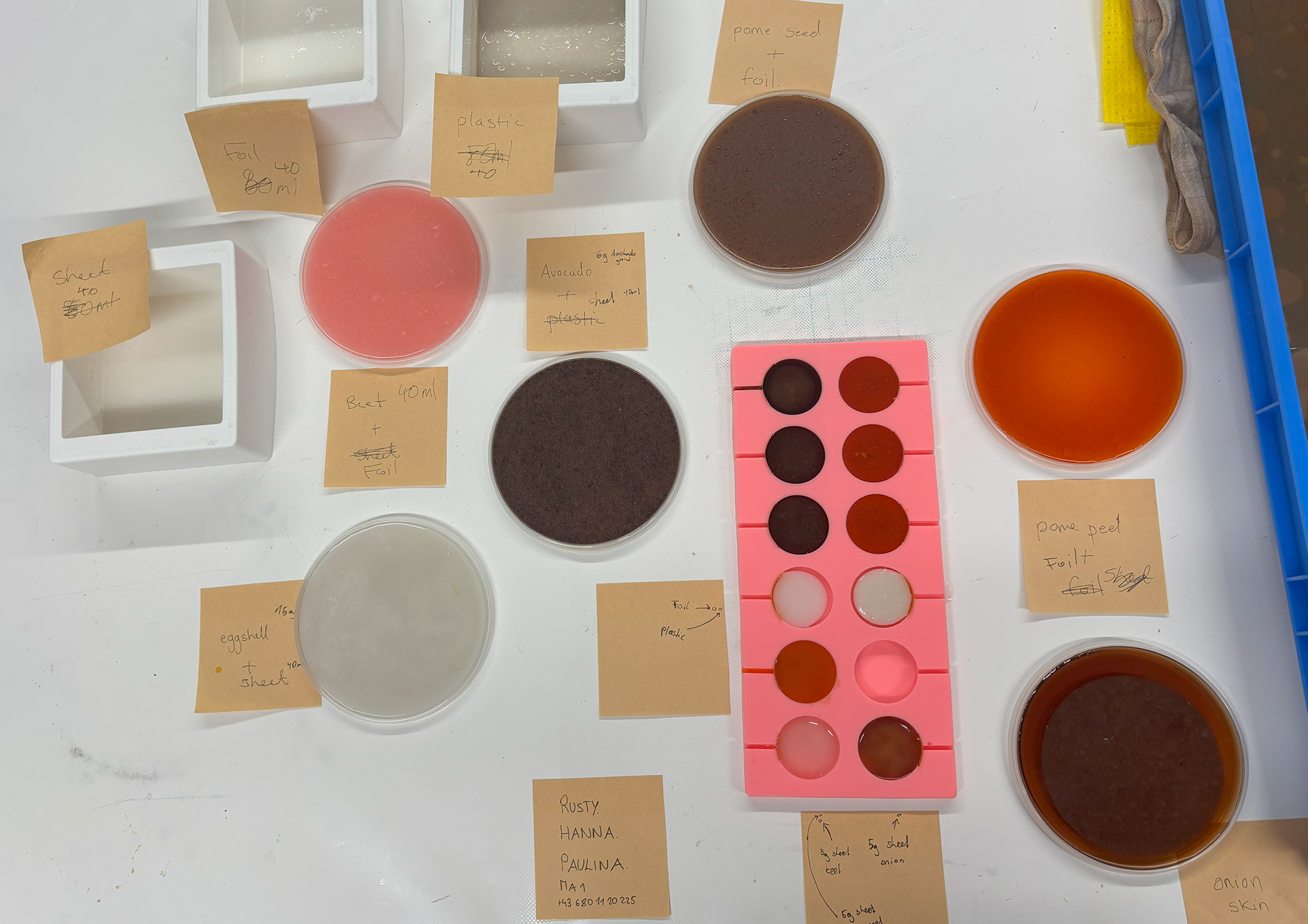Each blend revealed different material properties. To add colour and texture, we used natural sources such as pomegranate, orange, strawberry, avocado, red onion peel, and eggshells.