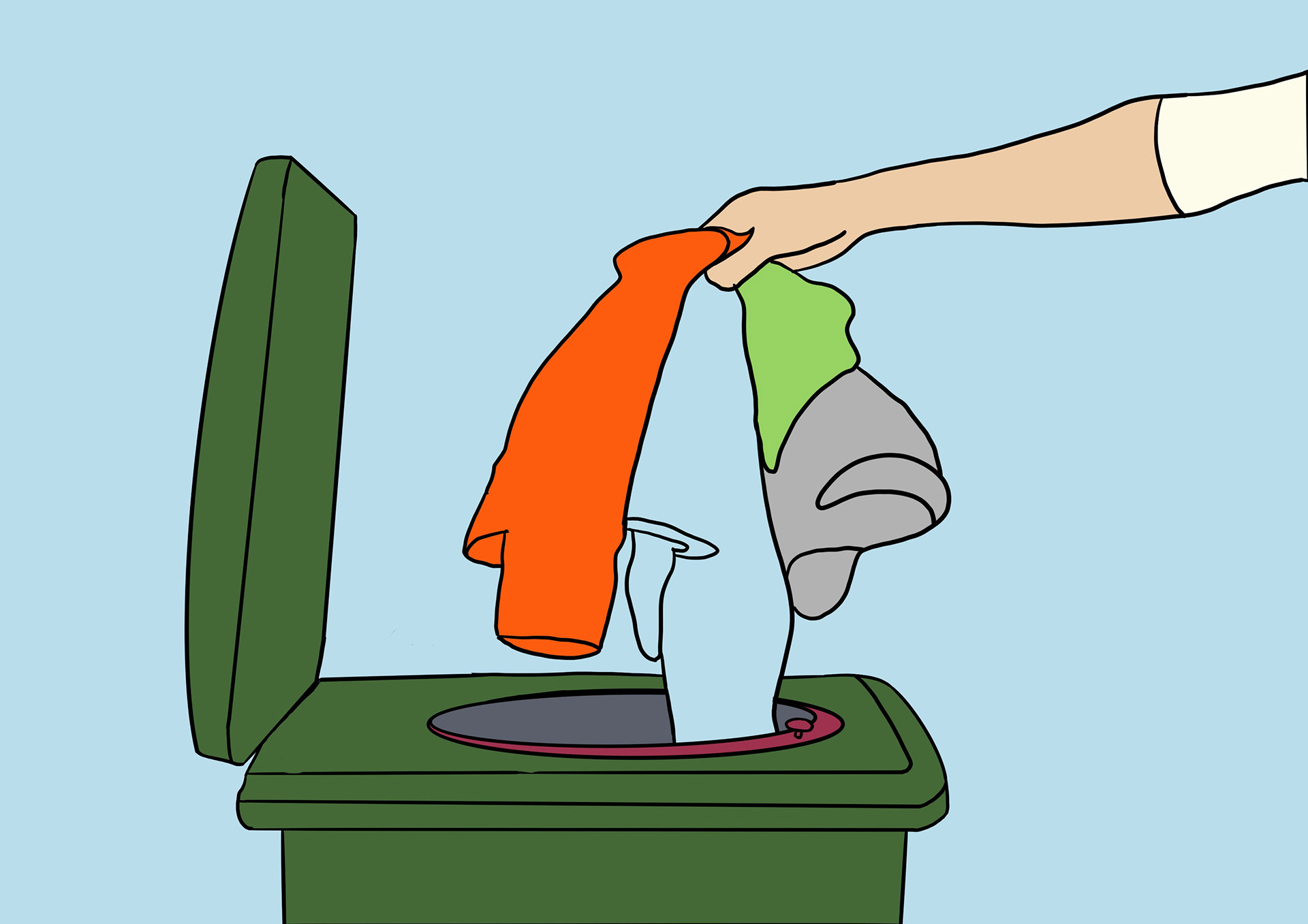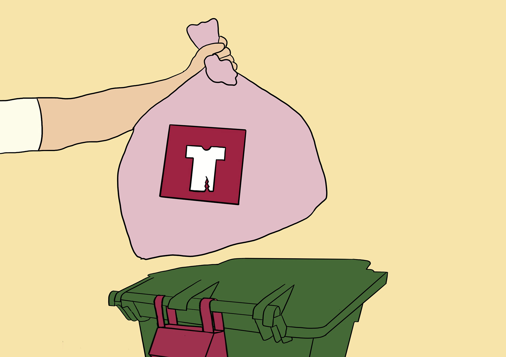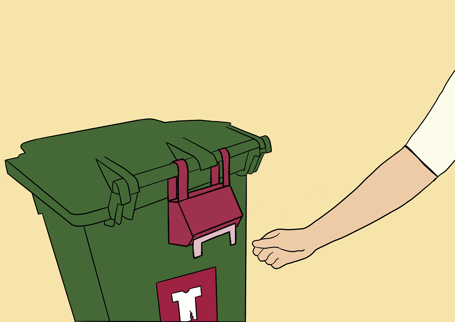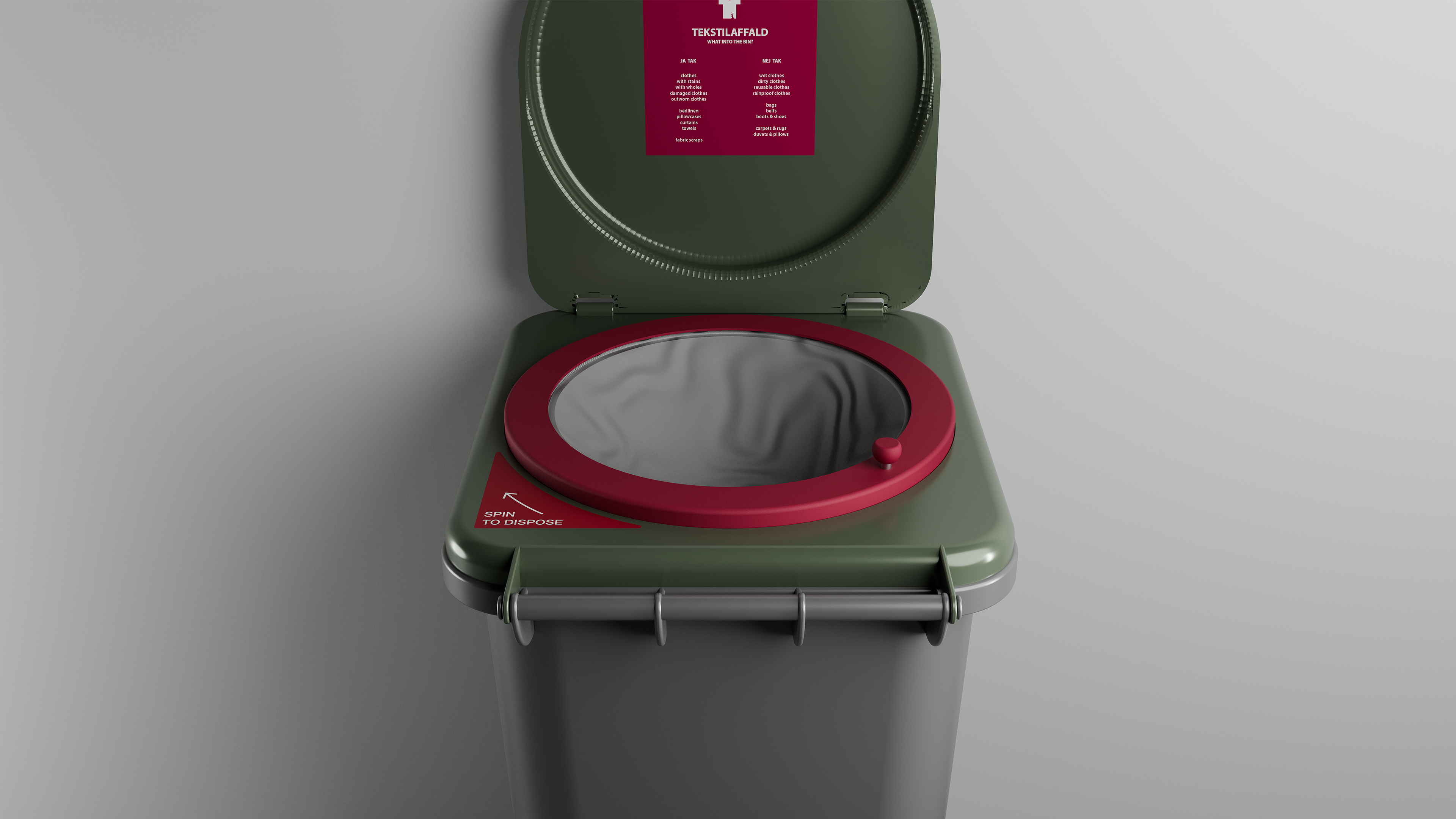 The long-term solution is a redesigned bin lid that includes an automatic bagging system to prevent unbagged textile waste and contamination. When the user opens the lid, a revolver unit with a continuous tube bag is revealed. After placing the waste inside, the user spins the handle to seal the bag segmenting it "like sausages." Instructions inside the lid guide proper use, and the user lid protects the system from weather.