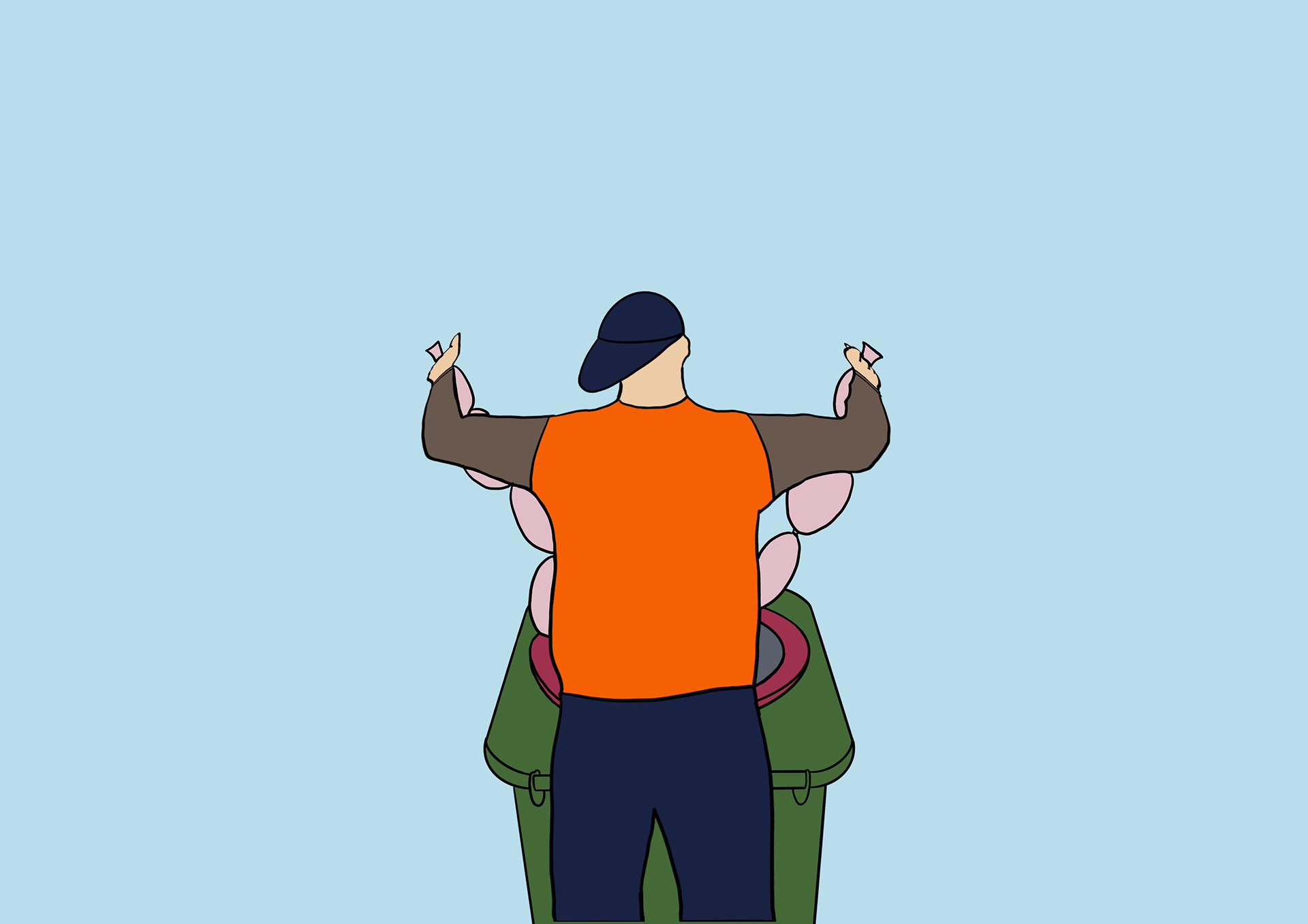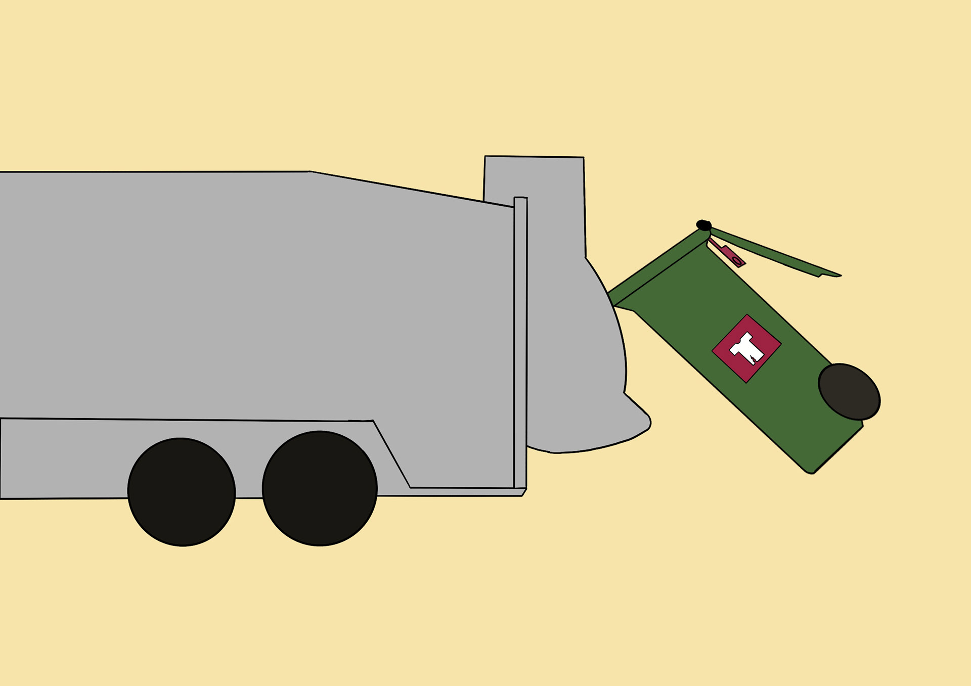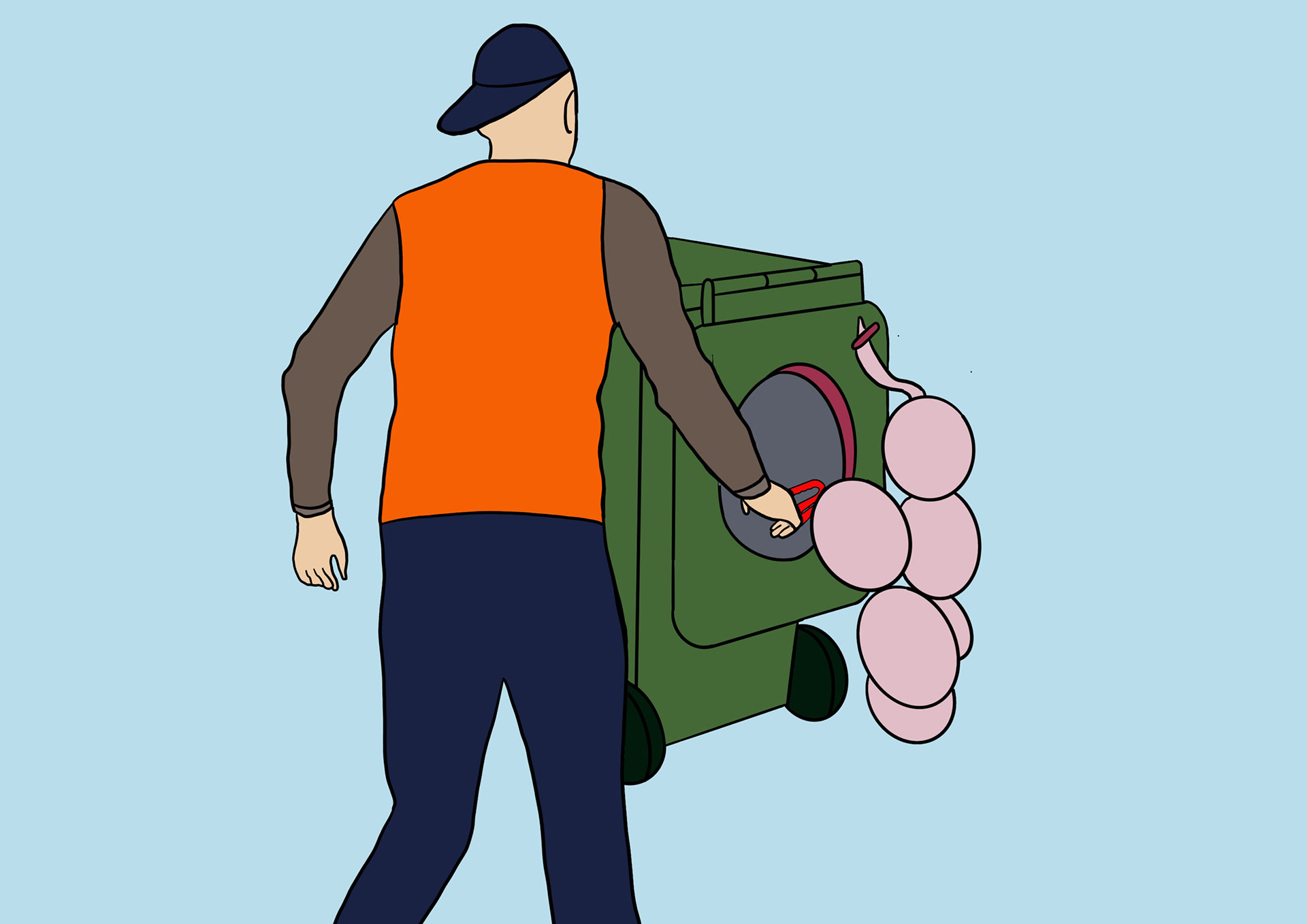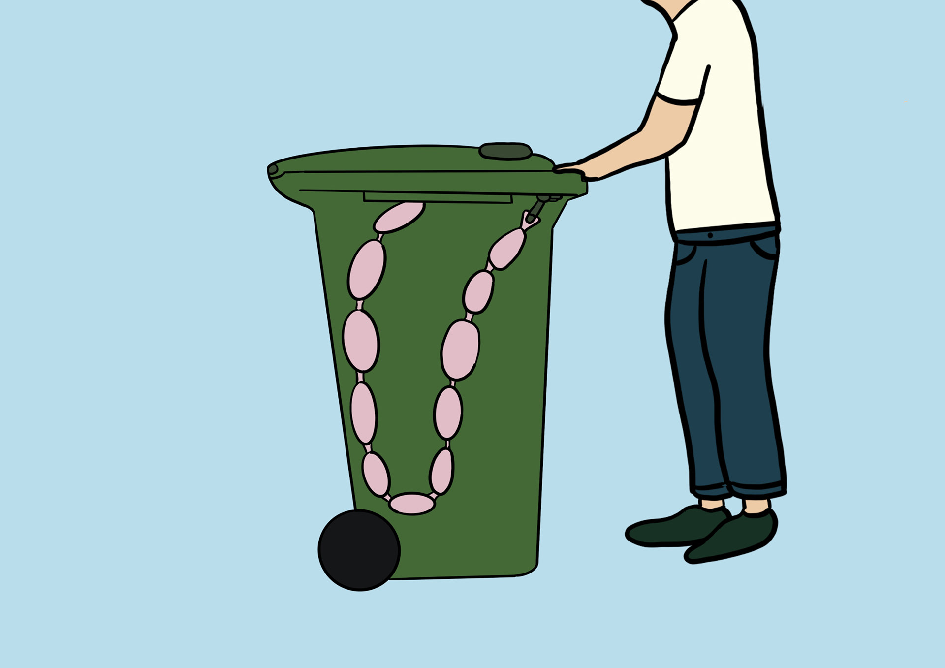 The long-term solution is a redesigned bin lid that includes an automatic bagging system to prevent unbagged textile waste and contamination. When the user opens the lid, a revolver unit with a continuous tube bag is revealed. After placing the waste inside, the user spins the handle to seal the bag segmenting it "like sausages." Instructions inside the lid guide proper use, and the user lid protects the system from weather.