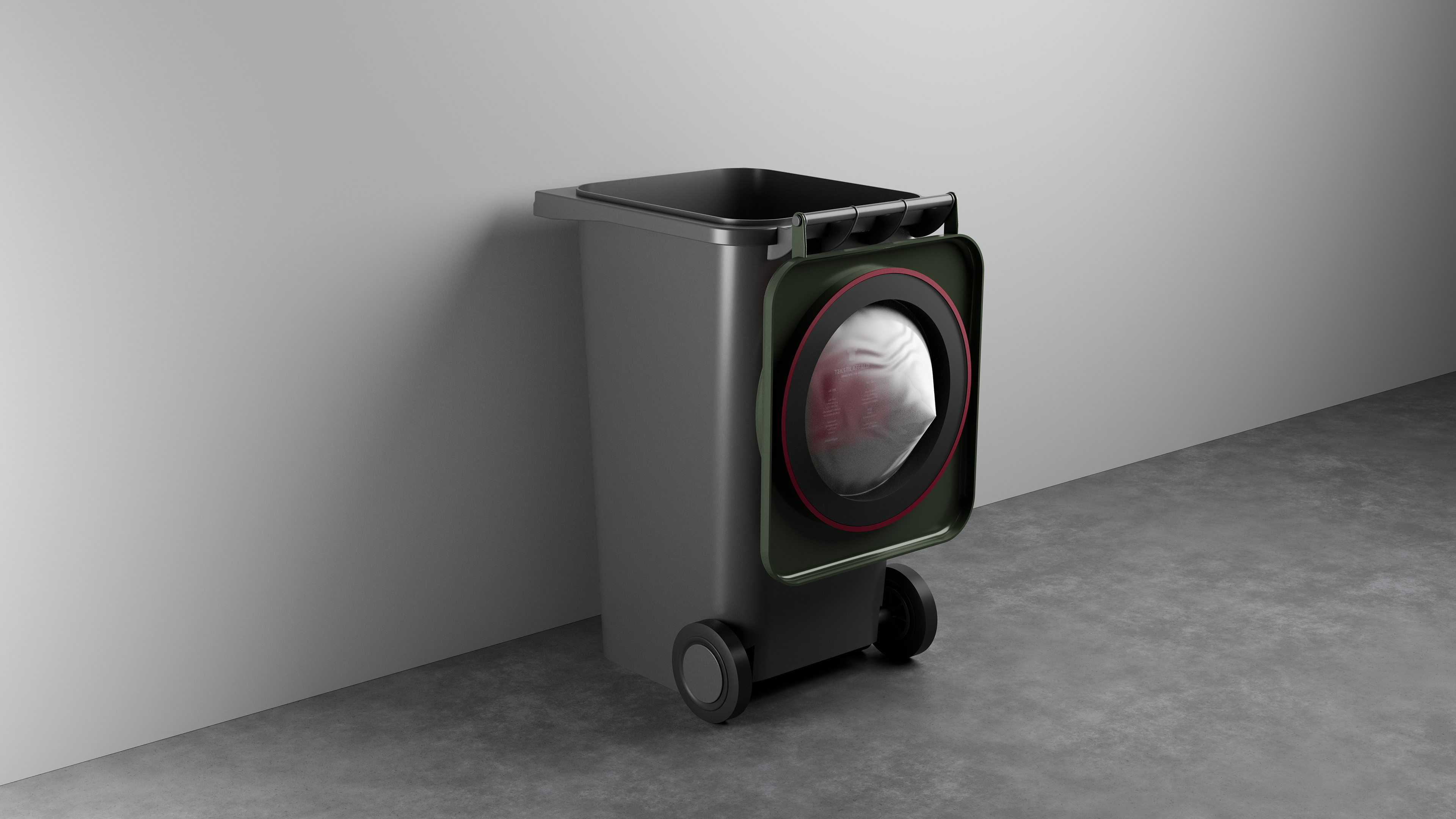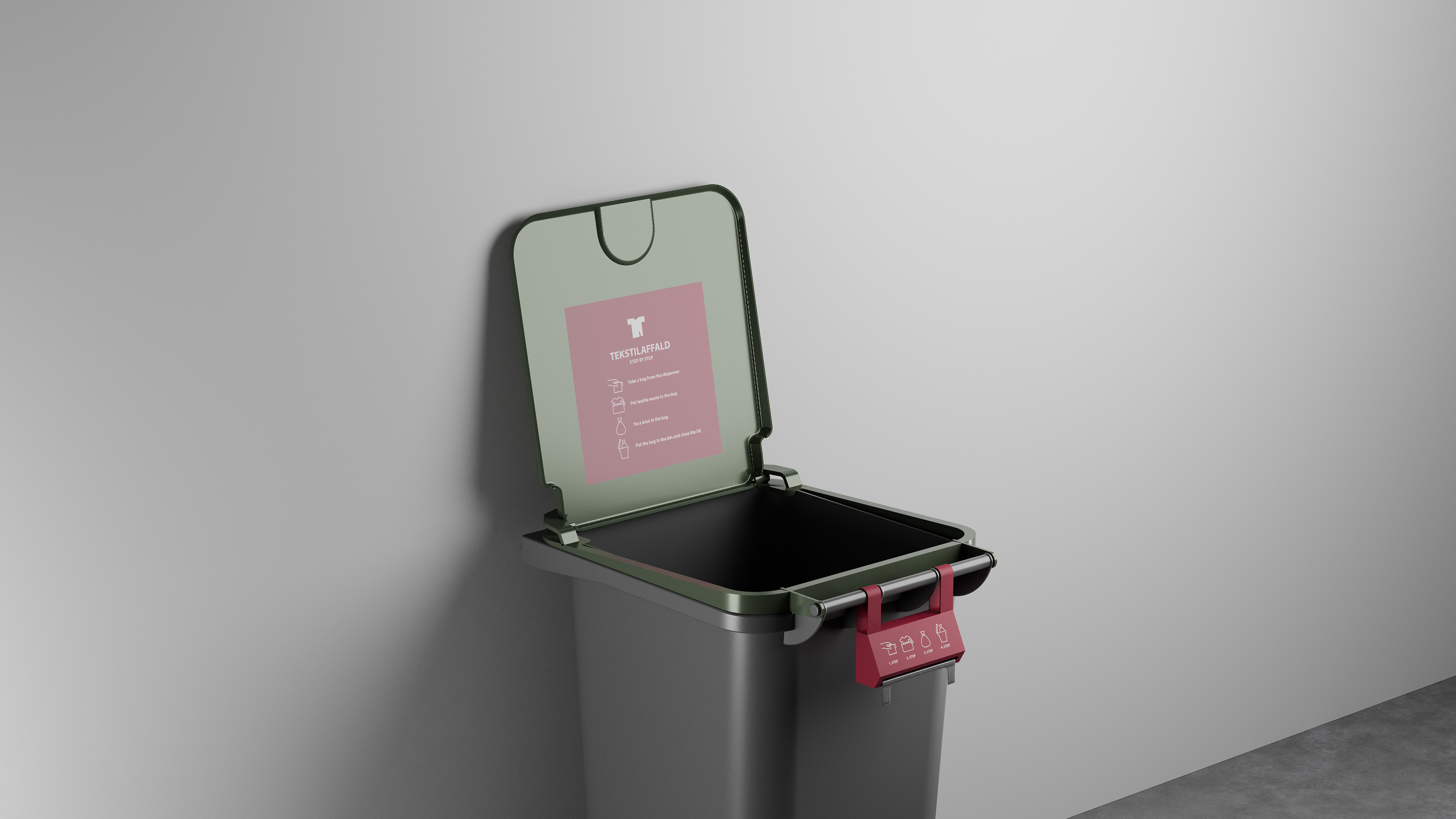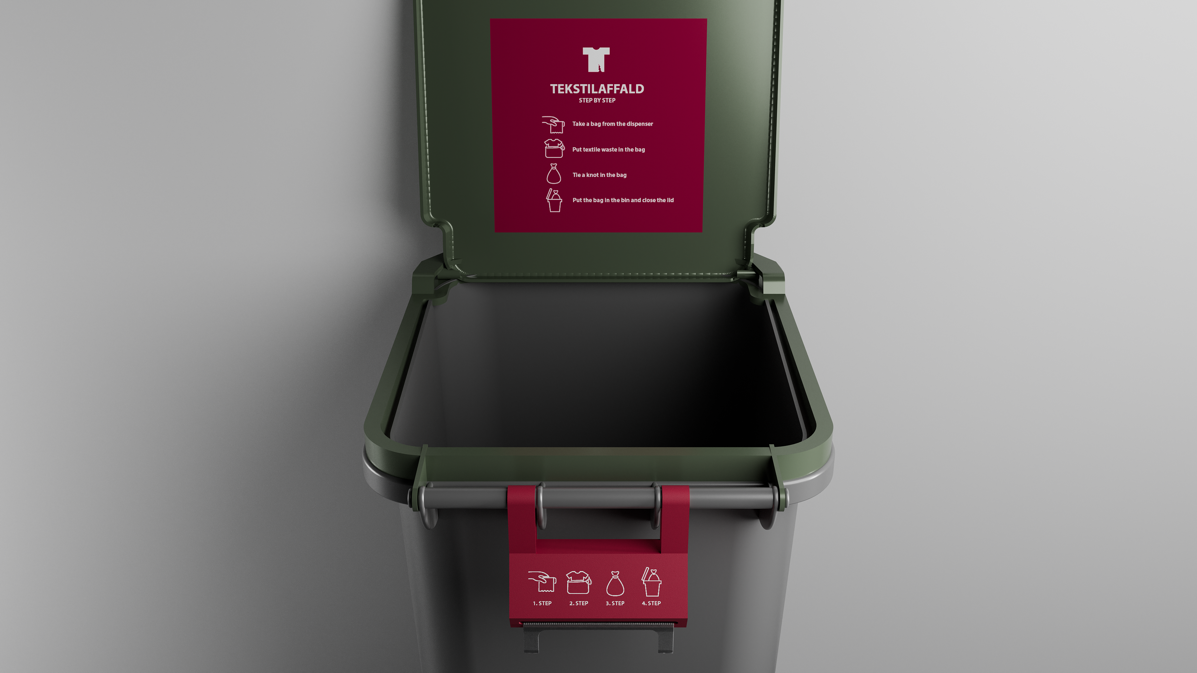 The bag dispenser provides users with bags and clearly communicates the importance of sealing textile waste before disposal. It can be made from powder-coated metal or plastic, depending on budget and quantity. The existing bin and lid remain unchanged, with the dispenser permanently attached to the handle without affecting its function.